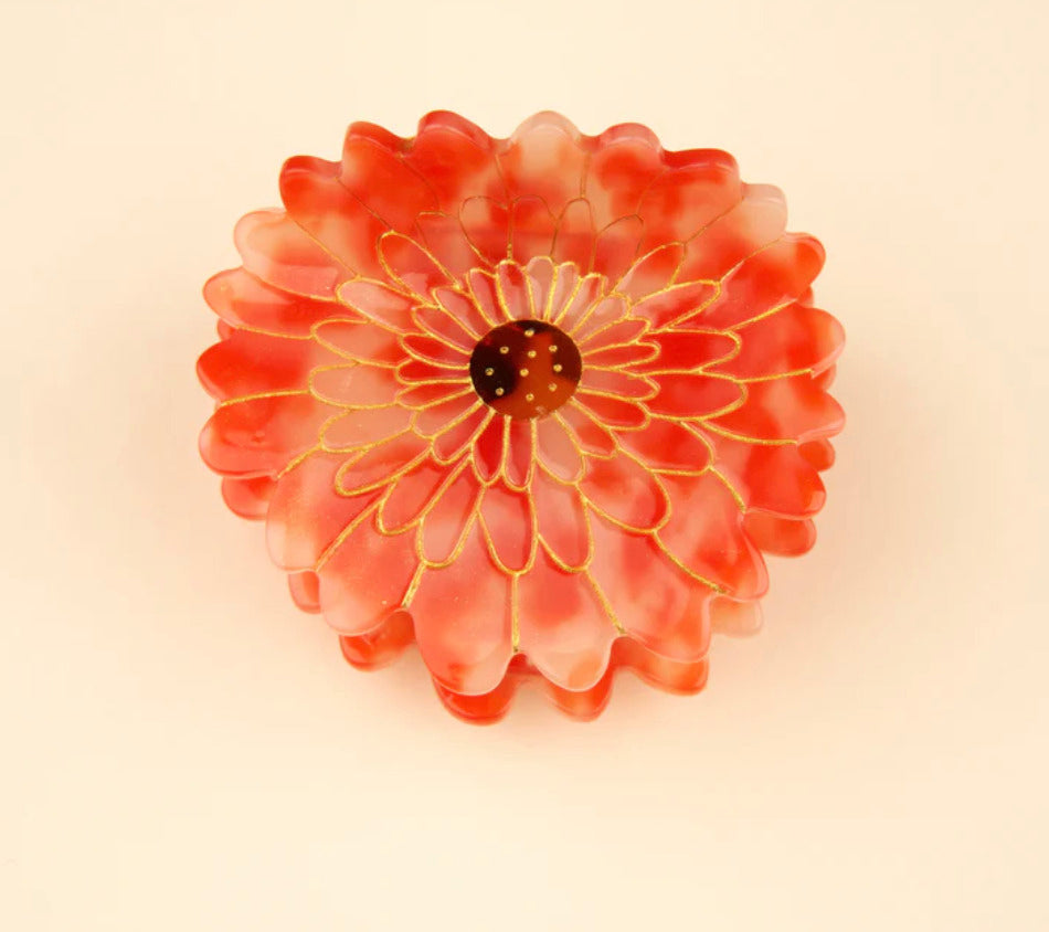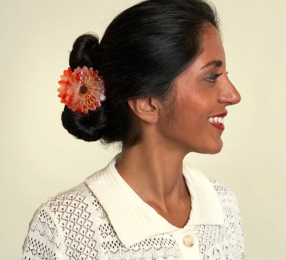 Place à une pince à cheveux dont la bôté fait parler jusque dans les chaumières : la pince Dahlia ! On raffole des ses pétales infinis et de ses teintes rouges nuancées qui la font rayonner dans nos chevelures. Elle fleurit avec joie dans les cheveux mi-longs et longs, parfaite pour maintenir un chignon ou une demi-queue pour les crinières les plus imposantes.